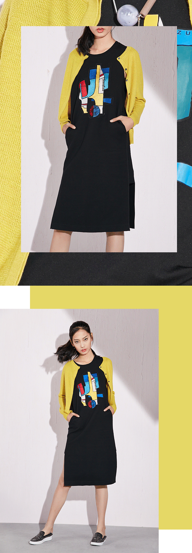 运动休闲风格搭配上大色块抽象图案,设计师运用丰富的想象力把另类的画作-涂鸦作为此杆的元素,鲜艳的色块撞击,配合律动感的廓形,针织和网孔的面料,组合出既时尚又年轻的一组作品。