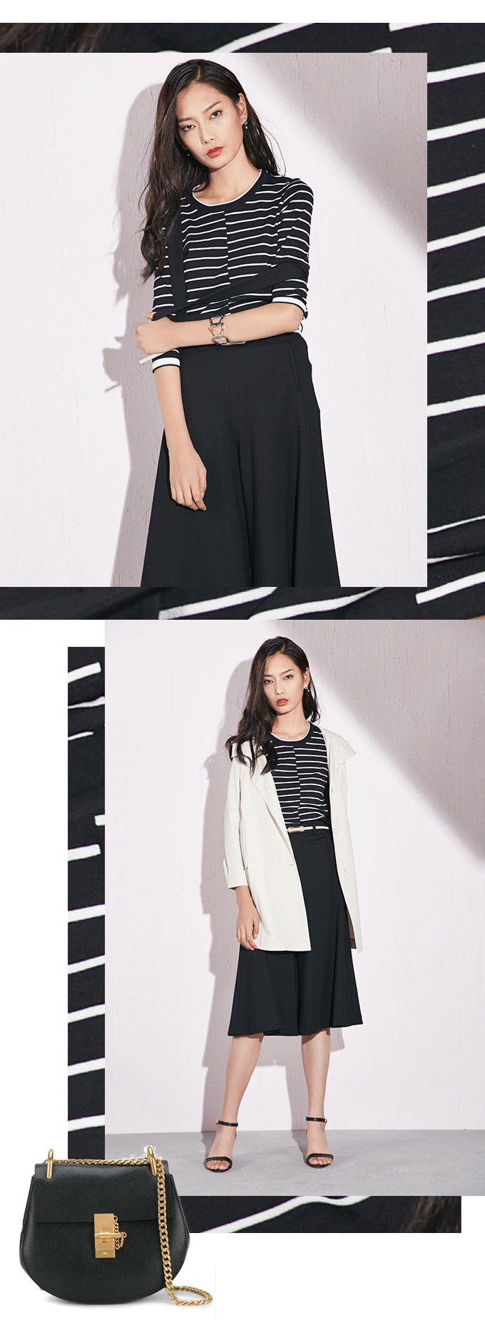 经典永存的条纹针织,虽没有轻盈飘逸的质感,却兼具文艺与优雅。除此之外条纹针织衫在穿衣风格方面具有较大的延伸性,即使在匆忙的时间内,也能使你以最快的速度完成一套完美优质的look,轻松穿出时髦感。