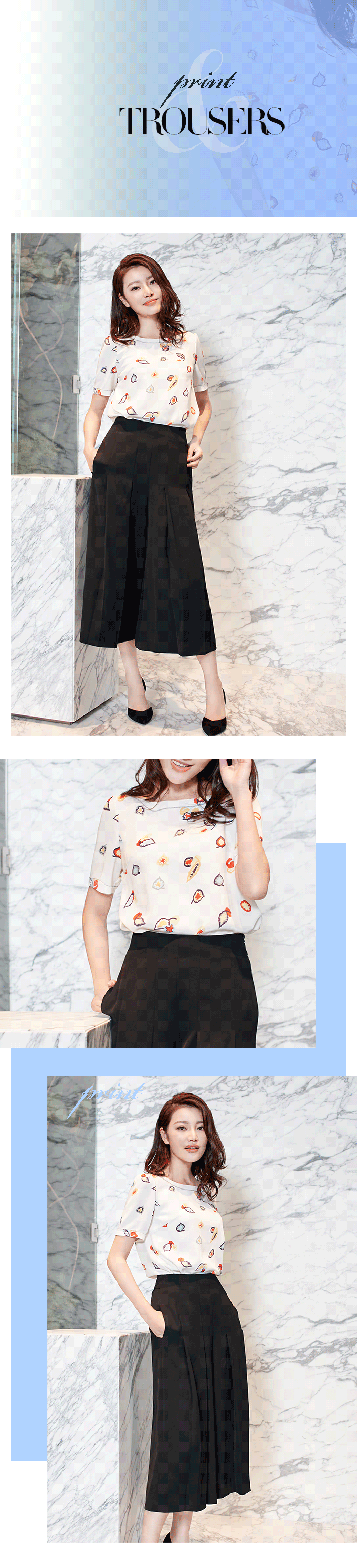 跟上潮流也是打造无龄感的有效途径,娘man平衡可是时下最流行的穿搭法则,不妨拿来一试。黑色高腰阔腿裤,纤细的脚踝与飘逸的裤管形成对比,立即产生强大气场,搭上印花短袖就柔和不少;而白色宽松型八分裤要配上深蓝印花短袖及黑色小高跟,才是平衡之道。