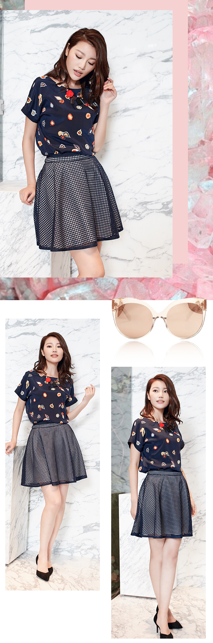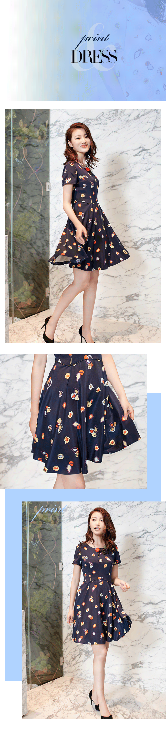 优雅的女人能让时间望而却步,因为她们不仅有气场更有气质。要穿出气质,也并不是难事,一条深蓝印花连衣裙,X版型加上腰节波浪设计,再配合晕染的新花型,就能显出知性来;而深蓝短袖与网格短裙及黑色高跟的组合,显瘦显高,最是时髦。