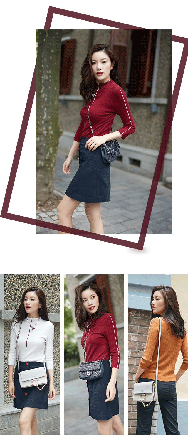 本款中袖套头小衫,可打底可单穿,温暖舒适贴合身型,凹凸有致的纹路加上撞色线条更显摩登之感。三款三色,各有腔调。白色大气,搭配错落V领裙,高级雅致;驼色是最接近秋天的颜色,穿上它,就像被大地拥着,感受轻柔的温暖,配上黑色九分裤,何不忙里偷闲一起散个步;酒红深情却藏而不露,却在换上这条橙扣半裙之后,变得跳动起来。