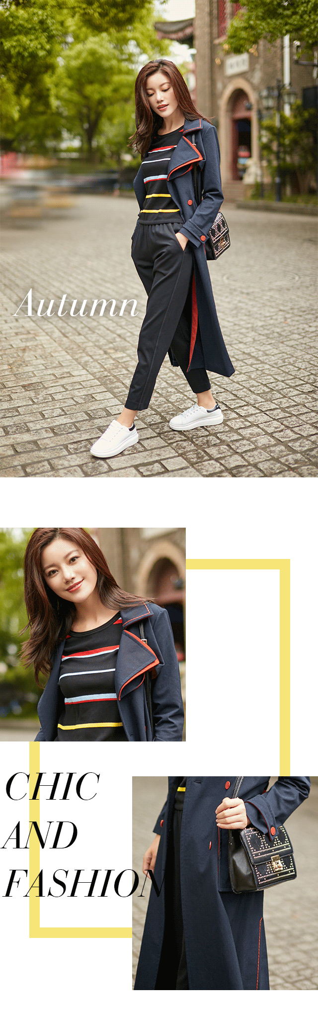 黑色小衫总是太过低调,不如再添上几笔,定睛一看,那些用红黄蓝绘出的条纹,竟有雨后彩虹的风采。套上这件长款撞色风衣,边缘的橙色恰与小衫相呼应,演绎大气休闲风范。