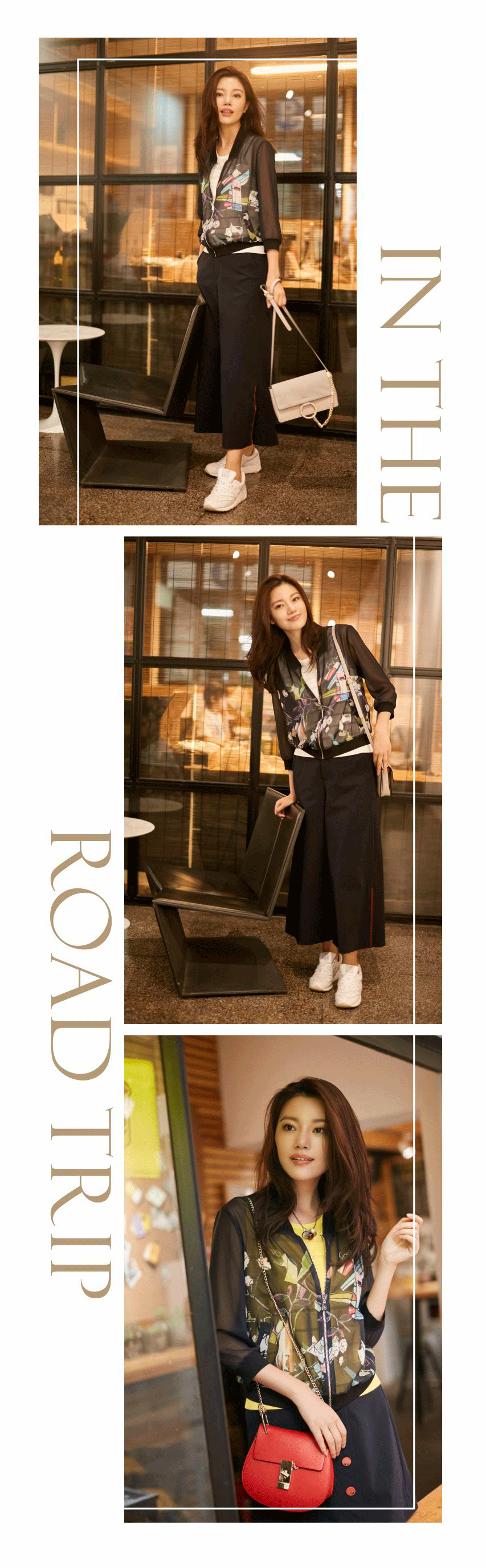 威尼斯白天平均温度 27℃,夜间平均温度 17℃,亮色无袖小衫外搭印花雪纺棒球外套,既能灵活应对变化的天气,又能满足貌美的需求。丈青色外套与威尼斯湛蓝的天空遥相呼应,设计师原创的“写意时光”花型,将水彩画作的静物花型通过撕碎的方式重新组合,恍如将如画般的威尼斯穿在了身上。