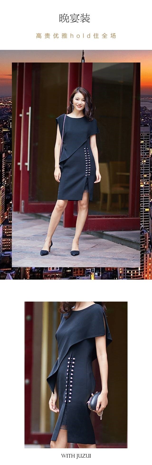 当珍珠遇上小黑裙,便碰撞出华美的火花。JZ玖姿本款黑色连衣裙,立体剪裁,突破常规的轮廓架构,充分勾勒女性优美曲线,令人眼前一亮,假两件式仿披肩设计极好地遮掩小腹,达到修饰身形的效果,让穿着者时刻保持完美姿态。腰侧可拆卸的珍珠装饰,为单调的黑色增添新意。因开衩设计而透露的蕾丝内村,在不经意间,散发出迷人的小性感,成为晚宴的经典之选。