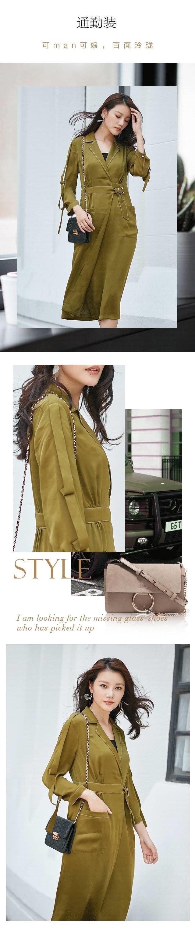 时已入秋,除了黑色与橘红色,最应景的还属军绿与芥黄的间色,季节过渡,树叶随之变化,把这动态的自然淋漓尽致地展现于本款修身真丝连衣裙之上,更显美感。v型镂空与圆环飘带的结合,切中流行,演绎柔美chic lady。