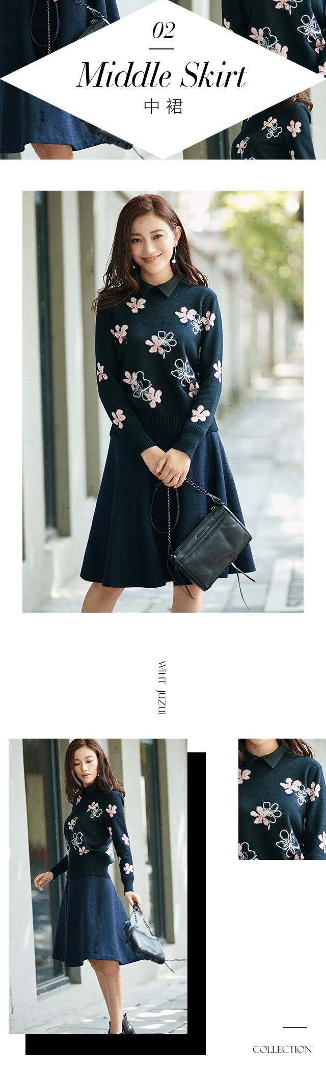 中裙的魅力在于知性,及膝的长度是刚刚好的保守与复古;收腰设计及微廓裙摆,又足以扬长避短;严选精纺毛料,裙身挺括自带高级质感。而樱花粉与暮色蓝对比,使得花型愈发动人,洋洋洒洒的,如同漫步花园那般惬意。再内搭黑色衬衫,不惧秋寒。