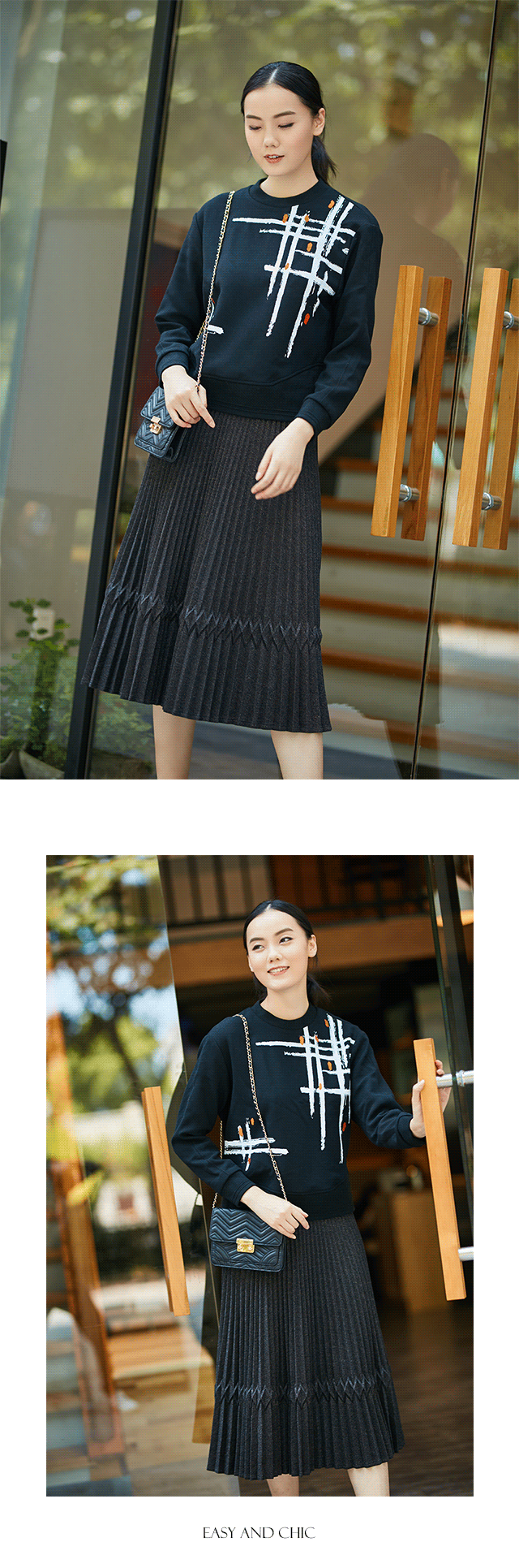 无论金属色还是纯色,只要有了一层一层的打褶,半裙就充满风情韵味。本款百褶裙,采用精纺毛料,柔软紧致,又化繁为简,以花黑为主色,将银丝揉如其中,演绎轻奢态度。与幻影格纹系列毛衫的组合,因笔触线条变化,而增添了几分艺术美感。