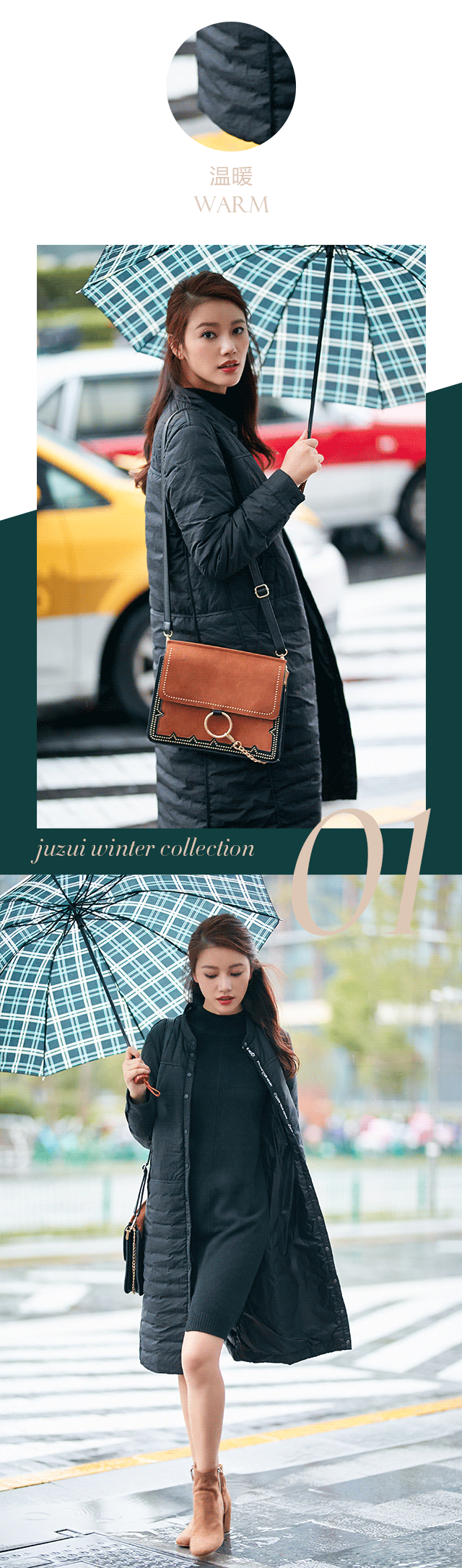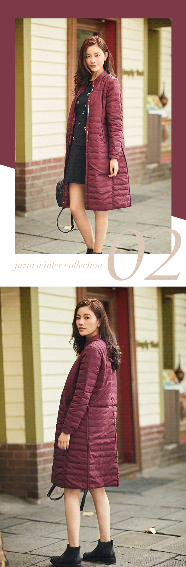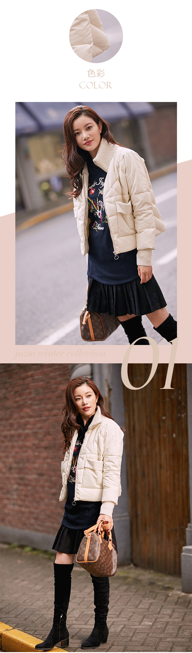 为告别臃肿,本季,JZ玖姿设计师把轻薄作为重点,带来全新的穿着体验。紧密压褶最大程度减少了绒毛的扩展空间,降低厚度的同时,又将温暖牢牢地锁在其中;门襟处的字母织带装饰,正贴合最近盛行的标语时髦,成为造型的点睛之笔。