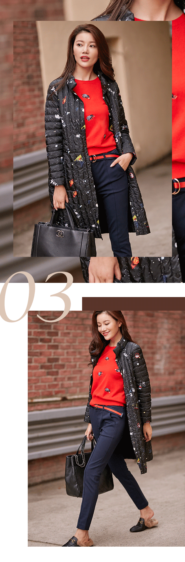那么不喜亮色的,该如何在萧瑟冬日“突出重围”呢?一抹刺绣就能带来新意。花卉以绽放之姿零星点缀于暮色蓝短款羽绒上,洋溢着些许生机,趣图夹杂其中,又增色不少,背上双肩包,更有青春活力。