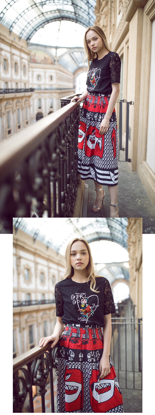 蕾丝有种神奇的魔力,能让女人更加成熟,能让女生更加清纯,胸前绣花加珠片工艺,精致而灵动,搭配极具波普艺术的花漾半裙,生活,就该如此“鲜艳”。