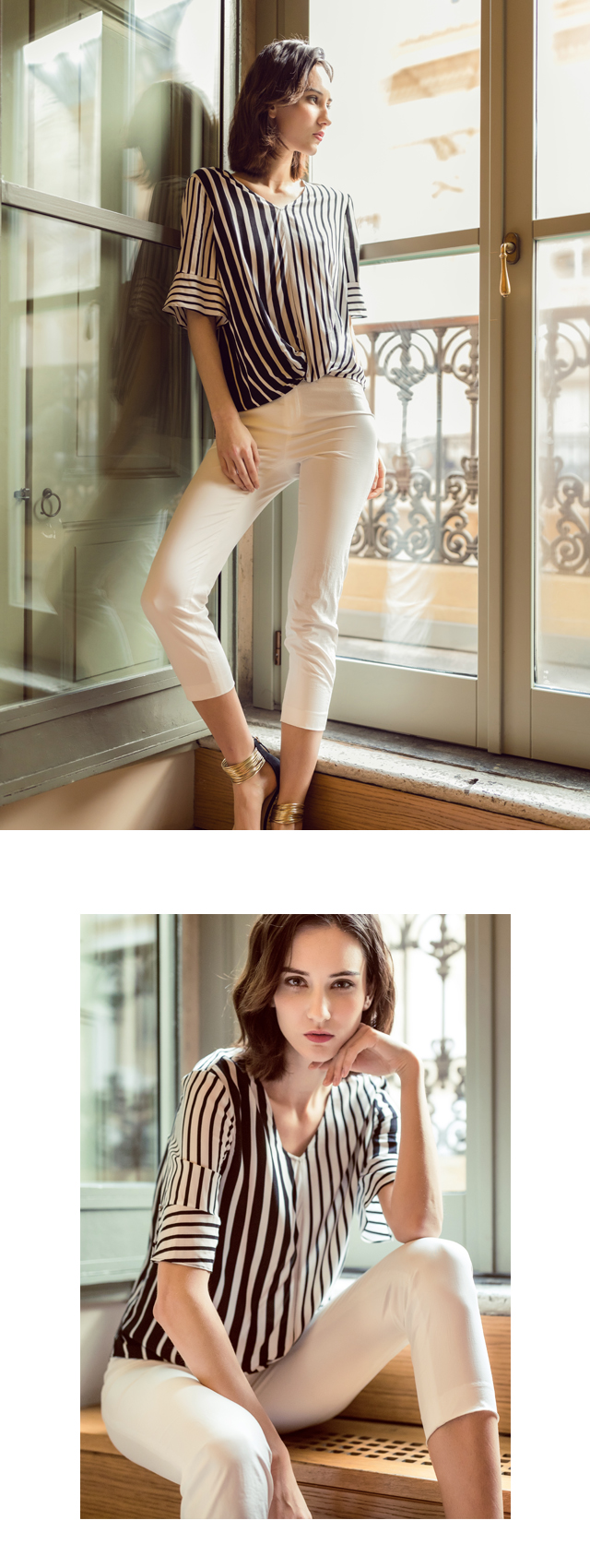人人都对小黑裤的百搭青睐有加,殊不知,小白裤也是清爽显瘦利器,黑白斑马条纹投射光影魅力,如果搭配小黑裤,未免沉闷了,而小白裤则有提亮之效,上衣扎入裤中,腰线自然提升。