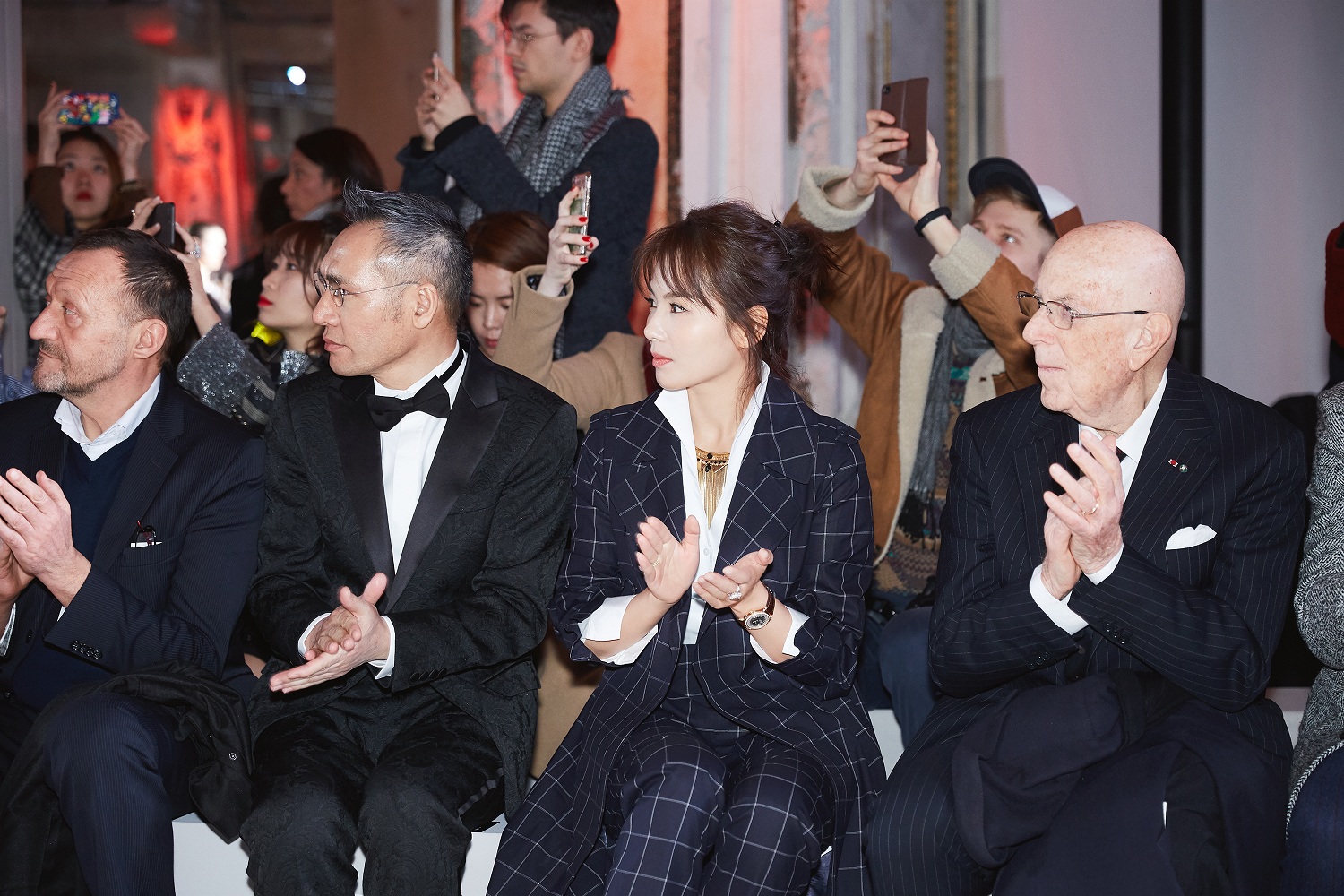 安正时尚集团董事长郑安政(左二)携手女星刘涛(左三)、意大利国家时尚商会(CNMI)名誉主席MarioBoselli(右一)出席2018“中国姿造”米兰时装周大秀