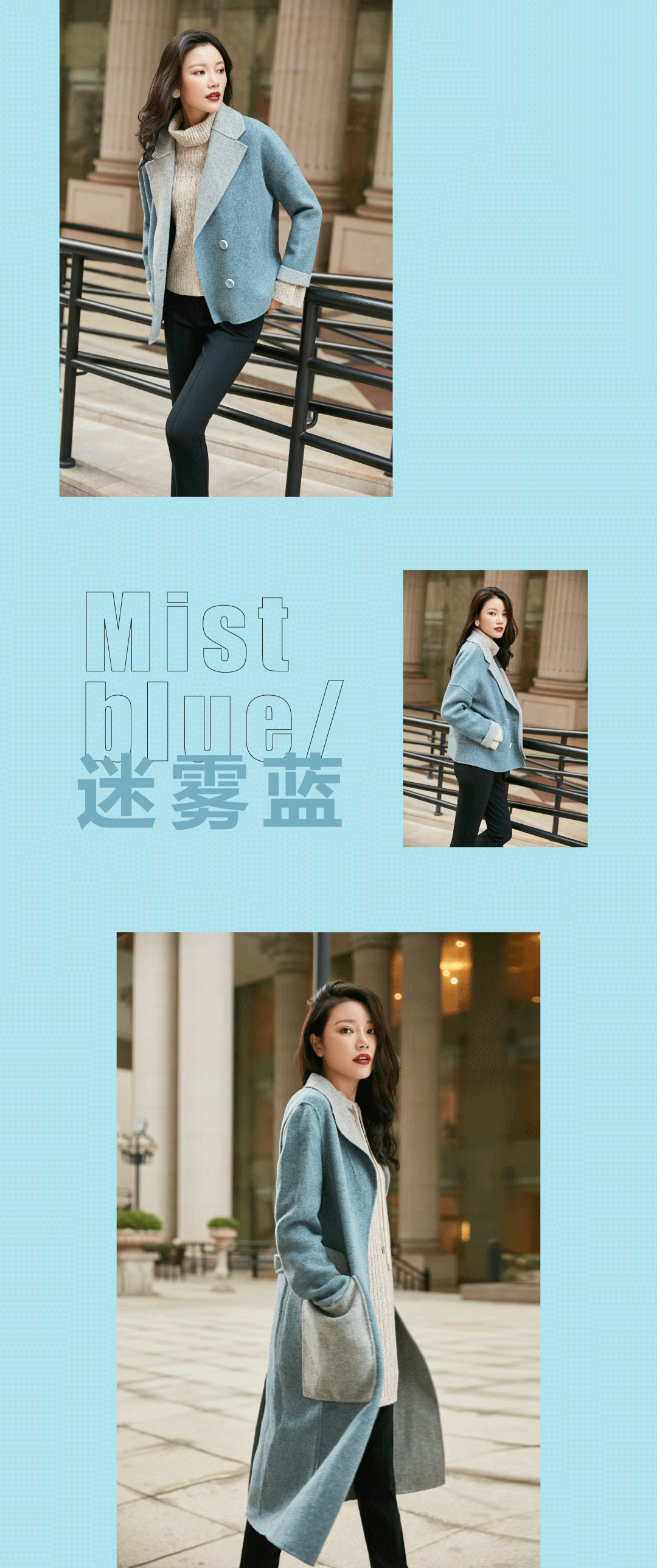 双面呢面料是源于意大利的高级双层梭织面料。以优质的山羊绒、羊毛、兔毛等天然面料制作而成,轻盈却保暖。玖姿迷雾蓝系列,淡雅有格调。